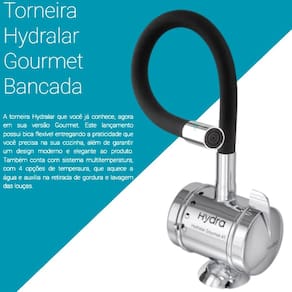 A torneira Hydralar que você já conhece, agora em sua versão Gourmet. Este lançamento possui bica flexível entregando a praticidade que você precisa na sua cozinha, além de garantir um design moderno e elegante ao produto. Também conta com sistema multitemperatura, com 4 opções de temperaura, que aquece a água e auxilia na retirada de gordura e lavagem das louças.