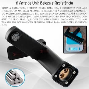 Toda a estrutura desta torneira é composta inox 304, um material altamente resistente a corrosão, garantindo máxima durabilidade. Seu revestimento combina em uma peça solida, com 690g de peso real, que oferece não apenas longa vida útil, mas também um acabamento premium, ideal para ambiente sofisticados.