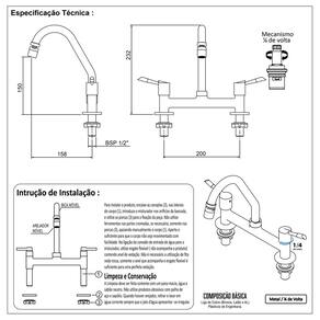 DADOS TÉCNICOS: - Garantia Fabricante: 5 anos - Posição de Instalação: Mesa - Bitola: 1/2 - Distância do furo para instalação: 20 cm - Pressão Mín.: 2 m.C.A - Pressão Máx.: 40 m.C.A - Vazão Mín.: 4 l/m - Vazão Máx.: 16 l/m - Temperatura Máx.: 70 C - Mecanismo: cerâmico 1/4 de volta - Composição: Corpo - Metal / Volante - Metal / Tubo - Metal / Canopla - ABS - Ciclo de abertura: 2 estágio - Tubo: Bica Móvel 360 com arejador móvel Marca: Shophidraulica