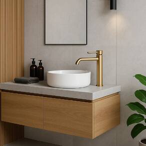 Funcionalidade com um toque de sofisticação. A torneira monocomando bica alta da Drop com acabamento dourado escovado é ideal para banheiros com cuba de apoio, combinando design moderno, controle preciso e acabamento de alto padrão.