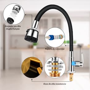 A Torneira Gourmet Flexível Bancada para Cozinha é fabricada em Metal Cromado de alta resistência garantindo alta performance mais dura idade e eficiência.
