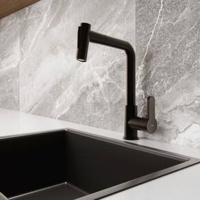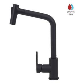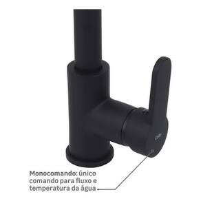 Esta torneira monocomando gourmet e ideal para cozinhas, proporcionando facilidade e eficiencia no uso diario. Com design moderno na cor preto fosco, ela se destaca pela bica alta que gira 360o, permitindo um alcance amplo. Oferece agua quente e fria com acionamento pratico atraves de uma alavanca de 1/4 de volta. Inclui um chuveirinho integrado, que facilita a limpeza de alimentos e loucas. A torneira e feita de metal resistente e vem com um arejador movel que otimiza o fluxo de agua, reduzindo respingos. Mede 37,6 cm de altura, 5,2 cm de largura e 20,3 cm de profundidade, sendo adequada para instalacao em furos de 50 mm. Suporta pressoes de 5 a 40 mca, ideal para sistemas de alta pressao. Acompanha de 10 anos.