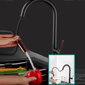 Sensor de toque, corpo de cobre, alça de liga de zinco, bico de plástico, bico de aço inoxidável 201 é pintado de preto, bico e alça de plástico são banhados na cor ouro rosa, aço inoxidável em ângulo reto, fixações de cobre, manga do corpo principal do produto saco de algodão pérola, correia Três mangueiras de aço inoxidável 304, feitas de porca G1 / 2 304, tubo trançado de náilon, duas juntas de núcleo de cobre M10 1, a outra é conectada à caixa de controle 30CM de comprimento, com porca G1 / 2 304 material, união de núcleo de cobre M15 Ean: 7891504101750