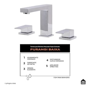 A Torneira para Banheiro Misturador Duplo Comando Purangi Baixa Pingoo.casa - Prata combina design moderno, funcionalidade e praticidade para banheiros sofisticados. Com dois comandos independentes, permite o ajuste preciso da temperatura e vazão da água, proporcionando maior controle e conforto no uso diário.O formato baixo é ideal para cubas embutidas ou de semi-encaixe, garantindo um visual equilibrado e elegante no ambiente.