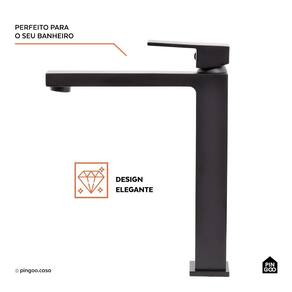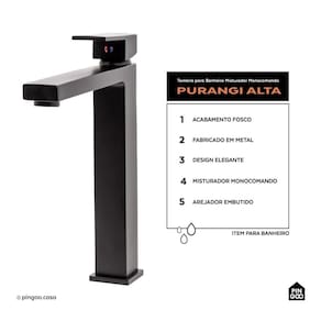 A Torneira para Banheiro Misturador Monocomando Purangi Alta Pingoo.casa - Preto combina design moderno, funcionalidade e praticidade para banheiros sofisticados. Com um único comando para controle de temperatura e vazão da água, oferece maior conforto e eficiência no uso diário. Seu formato alto é ideal para cubas de apoio, proporcionando um visual elegante e harmonioso no ambiente
