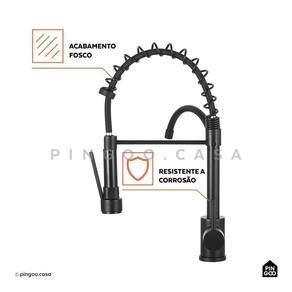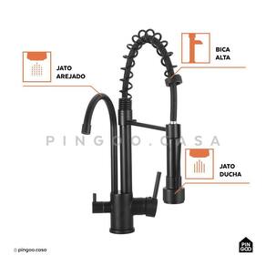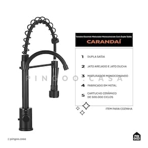 A Torneira Para Cozinha Carandaí da Pingoo.casa, possui duas saídas dágua, sendo uma com jato arejado e outra com jato ducha, cada uma com acionadores individuais para controle preciso da temperatura e intensidade do fluxo.