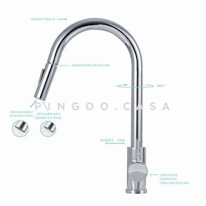 Com giro 360 graus, proporciona mais comodidade e um maior alcance de área em sua pia, assegurando mais mobilidade na hora de lavar a louça ou higienizar os alimentos, com funcionamento perfeito em baixa e alta pressão.