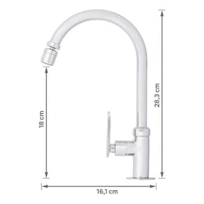 Transforme sua cozinha com a elegante Torneira Pia Cozinha Bica Alta Cromada da linha Londrina. Com seu design moderno e sofisticado, esta torneira e uma adicao deslumbrante para qualquer ambiente de cozinha. O acabamento cromado de alta qualidade proporciona um brilho prateado duradouro, enquanto o material de latao garante resistencia e durabilidade. Com uma altura de base ate a saida de agua de 18,00 cm e uma profundidade de 21,00 cm, esta torneira e perfeitamente dimensionada para a maioria das pias de cozinha. A bica alta da torneira oferece uma mobilidade de 360o, permitindo um acesso facil e conveniente ao fluxo de agua de todos os angulos. Apesar de nao possuir flexibilidade, a torneira oferece um jato de agua comum, ideal para todas as suas necessidades de cozinha. O acionamento da torneira e feito atraves de uma alavanca, com um 1/4 de volta, tornando-a facil e simples de usar. Alem disso, a torneira vem com um arejador movel, que ajuda a prevenir respingos e reduzir o consumo de agua. Esta torneira e indicada para uso com agua fria e pode suportar uma pressao de funcionamento minima de 3,00 mca e uma pressao de funcionamento maxima de 50,00 mca. Ela nao possui filtro de agua ou saida para agua filtrada, tornando-a uma opcao simples e eficiente para a sua cozinha. Com uma do fabricante de 60 meses, voce pode ter a certeza de que esta investindo em um produto de qualidade. Resumo das Especificacoes: Marca: Delinia Produto: Torneira Local Indicado: Pia Comodo Indicado: Cozinhas Temperaturas da Agua: Agua Fria Bica: Alta Mobilidade da Bica: 360o Tipo do Jato de Agua: Jato Comum Tipo de Acionamento Torneira: 1/4 de Volta Formato do Acionamento Torneira: Alavanca Acompanha Arejador: Sim Mobilidade do Arejador: Arejador Movel Altura da Base ate a Saida de Agua: 18,00 cm Profundidade da Torneira: 21,00 cm Pressao de Funcionamento Minima: 3,00 mca Pressao de Funcionamento Maxima: 50,00 mca Cor: Cromado Material: Metal Tipo de Material: Latao Linha: Londrina do Fabricante: 60 meses Referencia do Produto: SD82325. Marca: Não Informado