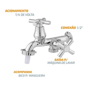 Acionamento com apenas 1/4 de volta, maior controle sobre o consumo da água; Bico para mangueira incluso, é só encaixar e utilizar; Saída para conectar a máquina de lavar, com apenas uma torneira você faz dois tipos de uso; Conexão de 1/2, padrão na maioria dos locais; Super leve e resistente, não enferruja e não mancha; Tamanho minimalista, não atrapalha o uso no tanque;
