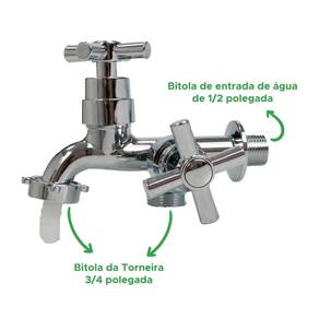 Características principais: - design moderno: acabamento cromado que adiciona um toque de elegância à sua área de serviço. - dupla saída: duas saídas independentes para facilitar a utilização simultânea no tanque e na máquina de lavar. - construção em abs: material durável e resistente, garantindo longa vida útil. - fácil instalação: projeto concebido para uma instalação descomplicada e rápida. - versatilidade: ideal para atender às demandas diárias de lavanderia, proporcionando praticidade e eficiência. - 1/4 de volta