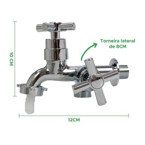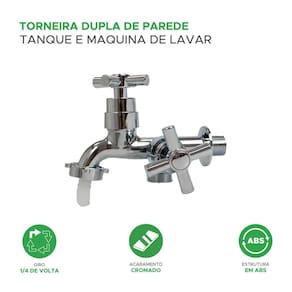 Características principais: - design moderno: acabamento cromado que adiciona um toque de elegância à sua área de serviço. - dupla saída: duas saídas independentes para facilitar a utilização simultânea no tanque e na máquina de lavar. - construção em abs: material durável e resistente, garantindo longa vida útil. - fácil instalação: projeto concebido para uma instalação descomplicada e rápida. - versatilidade: ideal para atender às demandas diárias de lavanderia, proporcionando praticidade e eficiência. - 1/4 de volta