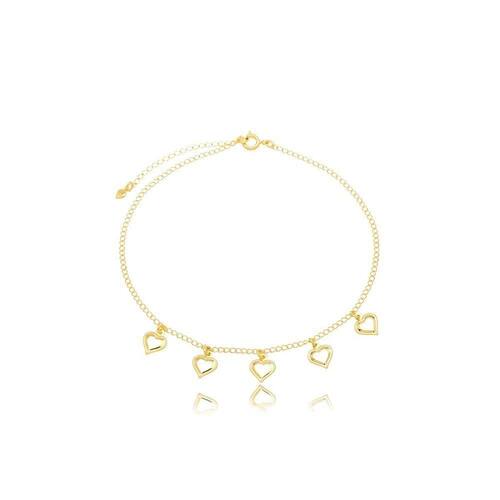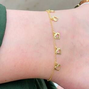 Tornozeleira Elos Delicados E Corações Pendurados Banhados A Ouro 18k Tornozeleira Elos delicados e Corações pendurados Banhados a Ouro 18k 24cm - Tornozeleira Elos delicados e Corações pendurados Banhados a Ouro 18k Tornozeleira banhada a ouro 18k com design delicado e sofisticado. Possui delicados elos e fecho ajustável com extensor, proporcionando um encaixe perfeito. O toque especial fica por conta dos pingentes de coração, que traz charme e elegância. Ideal para usar no dia a dia ou compor looks mais elaborados. Aposte nesta peça única para destacar o seu estilo com sutileza e sofisticação!