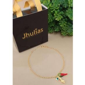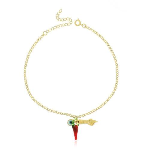 Tornozeleira Pingente de Pimenta Olho grego e Figa Banho de Ouro Tamanho da Tornozeleira: 24cm Figa 2cm x 07mm Olho Grego 0,6mm x 0,6mm Pimentinha 2cm x 0,5mm Peso Total : 3.9g - Acompanha embalagem para presentear conforme imagem - Acompanha certificado de -temos uma equipe preparada para te auxiliar no pós venda Jhulias Joias e Semi Joias Joias de Qualidade Marca: Não Informado
