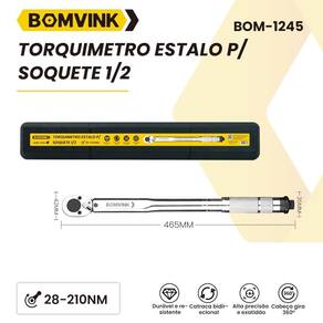 Produto: Torquímetro de estalo encaixe 1/2" capacidade 28 - 210 Nm - BOM-1245 Marca: Bomvink Descrição: O Torquímetro de estalo encaixe 1/2" capacidade 28 - 210 Nm BOM-1245 da Bomvink é a ferramenta ideal para profissionais que buscam precisão e durabilidade em seus trabalhos. Com capacidade de até 210Nm, ele garante apertos perfeitos em parafusos e porcas, evitando danos e garantindo a integridade das suas peças. Características: • Encaixe de 1/2": Adapta-se a diversos soquetes e acessórios. • Capacidade de 28 a 210Nm: Ideal para uma ampla variedade de aplicações. • Catraca bidirecional: Permite ajuste de torque tanto para aperto quanto para afrouxamento. • Alta precisão: Garante resultados confiáveis em cada utilização. • 360° de rotação da cabeça: Facilita o acesso a locais de difícil alcance. • Construção robusta: Durabilidade e resistência para trabalhos intensivos. Benefícios:- Aumento da produtividade: Trabalhos mais rápidos e eficientes.- Prevenção de danos: Evita o aperto excessivo de parafusos.- Maior segurança: Garante a integridade das suas peças e equipamentos.- Versatilidade: Ideal para diversas aplicações em oficinas, indústrias e construção civil. Ideal para: - Mecânicos: Aperto de parafusos em motores, chassis e outras peças.- Industriais: Montagem de equipamentos e máquinas.- Construção civil: Montagem de estruturas metálicas.- Profissionais em geral: Para qualquer trabalho que exija precisão no aperto de parafusos.Especificações: Capacidade: 28 - 210NmEncaixe: 1/2"Direção: Bidirecional. Marca: Não Informado Ean: 7908782202748