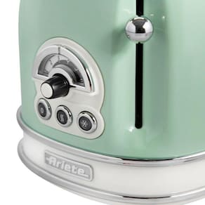 A torradeira elétrica da linha Vintage Ariete tem funcionamento eficiente, tosta duas fatias de pão ao mesmo tempo, pois possui dupla ranhura com possibilidade de escolher o grau de torragem do pão que preferir, graças aos seis níveis selecionáveis através dos manípulos. É uma ótima opção para preparar torradas ou aquecer pães para o café da manhã.