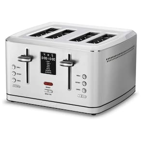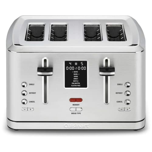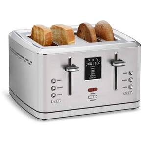 Torradeira Cuisinart CPT 740 com capacidade para 4 fatias, 1800W, tela digital com temporizador, 7 tipos de pães, opções de descongelamento e fatia única, alavanca de elevação alta e carcaça de aço inoxidável.Permite ejeção manual