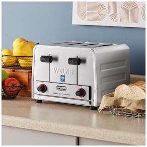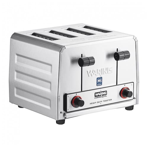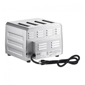 Torradeira comercial robusta em aço inoxidável com 4 fatias, controles eletrônicos, potência de 2200W, capacidade de até 300 fatias por hora e ajuste de nível de tostagem.Permite ejeção manual