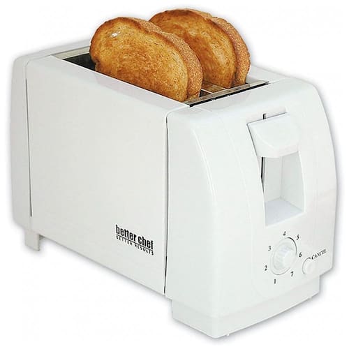 Torradeira Better Chef 110V com controle de escurecimento ajustável, botão de cancelamento, bandeja para migalhas removível e design compacto.