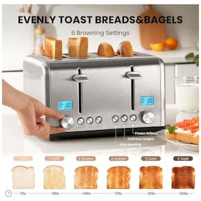 A torradeira de 4 fatias Roter Mond Countdown Stainless Steel é equipada com um display de LED e contador regressivo, indicando o tempo restante até que seu pão esteja pronto. Com slots extra largos de 3,8 cm, a torradeira em prata acomoda diversos tipos de pão, como bagels, pães artesanais grossos, muffins ingleses, waffles e torradas. Toasts uniformemente e rapidamente, possui corpo em aço inoxidável durável de alta qualidade. Com 6 níveis de tostagem e 3 funções, atendendo a todas as preferências. Fácil de usar e limpar, com bandeja de migalhas removível.