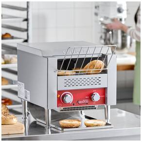 Esta torradeira de esteira é perfeita para qualquer cozinha comercial, sendo rápida, eficiente e fácil de usar. Com capacidade para torrar até 300 fatias de pão por hora, é possível acomodar desde fatias tradicionais de pão branco até metades de bagels robustos. Possui controle de velocidade ajustável para níveis de torra personalizados e pode ser colocado em modo de espera para economizar energia. Seu design único ajuda a produzir torradas perfeitas sem ressecar o produto. Esta torradeira de esteira pode torrar até 300 fatias de pão ou metades de bagel por hora em sua esteira de 10 polegadas, permitindo atender às horas mais movimentadas do dia. Além disso, graças ao modo de espera econômico, é possível conservar energia quando a torradeira não está em uso. Ela requer uma conexão elétrica de 110V para operação. O modo de espera mantém os elementos em potência reduzida para conservar energia entre os períodos de refeição, mas reduz o tempo de pré-aquecimento ao entrar em períodos de alto movimento. Para versatilidade, esta torradeira pode dispensar o produto pela frente ou pela parte traseira nas calhas incluídas. Além disso, possui 3 aberturas para acomodar grandes quantidades dos seus alimentos mais populares, desde pães fatiados tradicionais até bagels e torradas. Dispensar o produto pela parte traseira permite versatilidade de passagem da cozinha para o salão, enquanto dispensar o produto pela frente reduz a pegada de balcão da unidade e até permite que os usuários preparem o próprio produto para reduzir o custo da mão de obra. Diferentes tipos de pães torram de maneira diferente, desde branco e centeio até integral granuloso. Para ajustar a torradeira para a configuração perfeita, use o seletor fácil de usar na frente para diminuir ou aumentar a velocidade da esteira. Quanto mais rápido se move, menos tostado o pão ficará. Isso também é ótimo para garantir que a torrada de um cliente seja tostada conforme a preferência de crocância deles! A cozinha comercial é um ambiente rigoroso, então esta torradeira é construída de acordo. É um ótimo aliado para cafeterias, buffets e cafeterias, especialmente durante o rush matinal! Sua parte externa de aço inoxidável oferece durabilidade de longa duração, enquanto uma bandeja de migalhas removível torna a limpeza fácil.