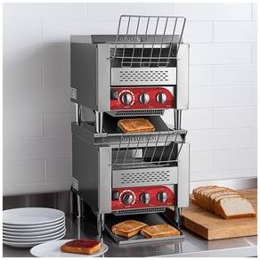 O design empilhado de alta eficiência desta torradeira tosta até 800 fatias de pão por torradeira, por hora, em uma esteira com 3 aberturas para uma variedade de pães, bagels e muffins. O guia de produtos na frente ajuda a carregar os alimentos. Velocidade do transportador totalmente ajustável e controle de calor independente com 8 configurações para obter a torrada perfeita. Construção robusta em aço inoxidável com pernas e botões de controle em aço inoxidável. 208V, 3300W por torradeira. Este conjunto de torradeiras de esteira apresenta um par de torradeiras de esteira T3300B empilhadas verticalmente para minimizar o espaço no balcão e maximizar a produção. Como pode tostar até 1600 fatias de pão ou metades de bagel por hora, você pode ter certeza de que está pronto para atender à demanda. Cada esteira de transportador de 10 polegadas de largura cabe 2 fatias lado a lado, enquanto seu tamanho de abertura de 3 polegadas acomoda uma variedade de produtos. O design único do elemento ajuda a produzir uma torrada perfeita sem ressecar o produto. Toste facilmente pão, bagels, muffins em inglês ou pãezinhos conforme o pedido do cliente. Um guia frontal até mesmo ajuda a carregar o produto com segurança, garantindo que cada fatia seja puxada diretamente para a unidade para torradas eficientes e consistentes. E com 2 torradeiras, você aumenta ainda mais sua flexibilidade, usando ambas as unidades para produzir volumes altos do mesmo produto, ou usando cada uma para fazer um produto assado diferente! Cada torradeira possui 8 opções de velocidade do transportador, que são fáceis de ajustar com botões de controle robustos. Esse controle permite que o operador selecione por quanto tempo o pão será torrado, determinando a coloração e crocância final. Além disso, os controles independentes são integrados para os elementos superior e inferior. Cada controle inclui configurações de 1 a 6 e fornece ao operador controle adicional para resultados de torrada personalizados e fáceis. Os controles individuais superior e inferior permitem que uma variedade de produtos seja torrada, como pães, bagels e muffins. Feito de aço inoxidável, este conjunto de torradeiras apresenta calhas dianteiras e traseiras fáceis de conectar e desconectar conforme necessário. Ele fica em pernas ajustáveis ??de aço inoxidável, garantindo que o balcão fique acessível para fins de limpeza. Cada torradeira horizontal de esteira requer uma conexão elétrica de 208V para operação. Para versatilidade, esta torradeira pode dispensar o produto pela frente ou por trás nas calhas incluídas. Além disso, possui 3 slots para acomodar grandes quantidades de seus alimentos mais populares, desde pão fatiado tradicional até bagels e pão de forma. Dispensar o produto pela parte de trás permite versatilidade de passagem da cozinha para a área de atendimento, enquanto dispensar o produto na frente reduz a pegada no balcão da unidade, e até permite que os usuários tostem o produto por conta própria para reduzir custos trabalhistas.