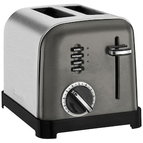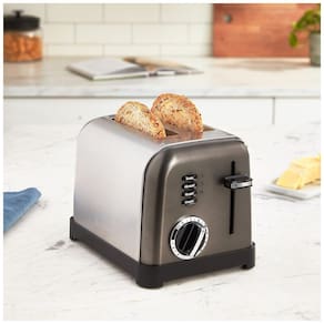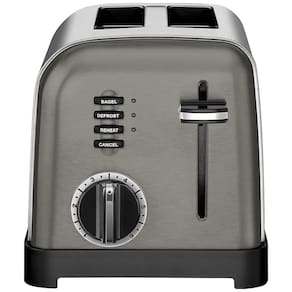 Torradeira elétrica Cuisinart para 2 fatias em aço inoxidável escovado com detalhes cromados e pretos. Possui 6 níveis de tostagem, botões de reaquecimento, degelo e função bagel.Permite ejeção manual