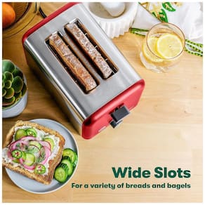 Torradeira elétrica 2 fatias, 750W, com 6 níveis de tostagem, bandeja de migalhas removível, slots extra largos, função reheat, guias de centralização automática e desligamento automático.Permite ejeção manual