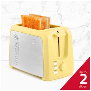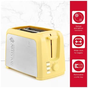 Torradeira elétrica 2 fatias com 7 níveis de tostagem, design compacto, acabamento em aço inoxidável e detalhes em amarelo. Possui funções de reaquecer, descongelar e cancelar.Permite ejeção manual