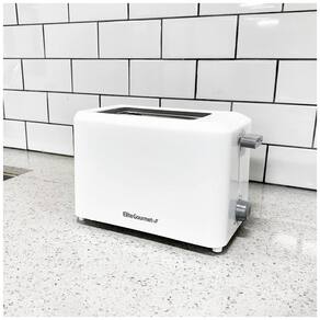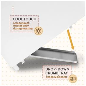 Desfrute de pão perfeitamente torrado, bagels, muffins ingleses e muito mais com a torradeira de toque frio de 2 fatias da cozinha Elite. As suas 6 tonalidades de tostagem variáveis permitem lhe torrar sempre ao seu gosto. Possui uma alavanca de tostagem para remoção fácil e segura dos pães, uma prática função de cancelamento para pré interromper o ciclo de tostagem, se necessário, e um exterior de toque frio para manuseio . Ele também possui uma conveniente bandeja de migalhas suspensa para uma limpeza rápida e fácil