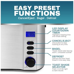 Torradeira Elétrica para 4 fatias com 6 níveis de tostagem, função descongelar, tecnologia Toast IQ, guias auto centrantes, rack de aquecimento e bandeja de migalhas removível.Permite ejeção manual