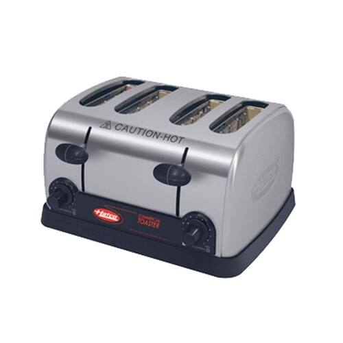 Torradeira elétrica prateada para 4 fatias, com 7 níveis de tostagem, slots autocentrantes, controles individuais de cor, bandeja de migalhas removível e certificação UL/CUL.Permite ejeção manual