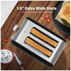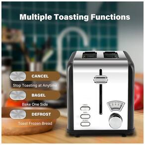 Torradeira elétrica para 2 fatias com 5 níveis de tostagem e 3 funções (bagel, descongelar e cancelar). Possui bandeja removível para resíduos, design retrô e corpo em aço inoxidável.Permite ejeção manual