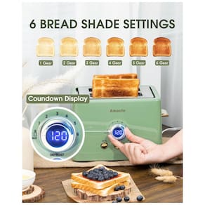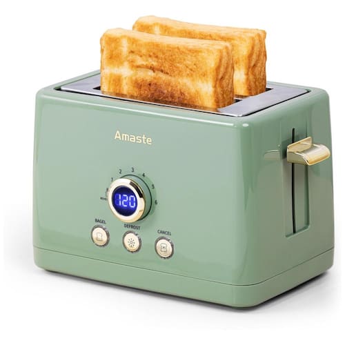Torradeira elétrica retrô Amaste para 2 fatias, com 6 níveis de tostagem, funções de descongelamento, reaquecimento e bagel, temporizador digital LED, alavanca de alta elevação e bandeja de migalhas removível.Permite ejeção manual