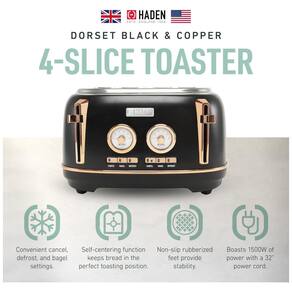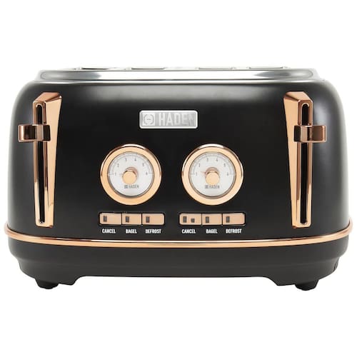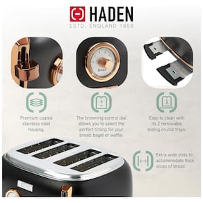 Características Torradeira de quatro fatias com slots extra largos para bagels Aço inoxidável pintado com emblema Haden, caixa de aço inoxidável pintada com emblema Haden, função autocentrante e bandeja de migalhas removível. Especificações 1500 W, 120 V 60 Hz, plugue padrão de 2 pinos dos EUA, testado e aprovado por ETL. Recursos de tostagem Função de autocentragem mantém o pão na posição perfeita para torrar, Bandeja de migalhas removível, Controle de escurecimento ajustável, Cancelar, descongelar e reaquecer