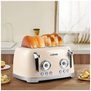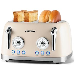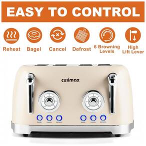 Torradeira elétrica retrô para 4 fatias em aço inoxidável, com 6 níveis de tostagem, painel de controle duplo independente e funções bagel, cancelar, descongelar e reaquecer.Permite ejeção manual