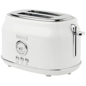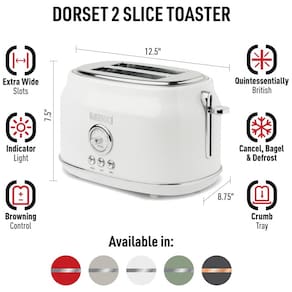 Torradeira HADEN Dorset 2 fatias em aço inoxidável com acabamento brilhante e detalhes cromados. Possui fendas extra largas com grade autocentralizadora, 6 níveis de controle de dourado, funções de cancelar, descongelar e reaquecer. Corpo com toque frio, recurso de elevação alta, pés antiderrapantes e bandeja de migalhas removível.Permite ejeção manual