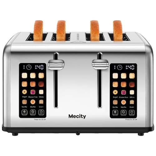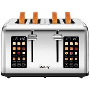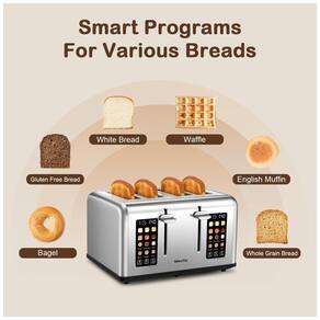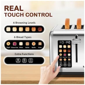 Torradeira para 4 fatias com tela sensível ao toque, 6 níveis de escurecimento, 3 programas, dois painéis de controle independentes, aberturas em aço inoxidável antiaderente e bandeja removível para migalhas.Permite ejeção manual