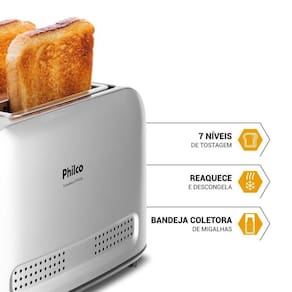Torradeira Philco com 7 níveis de tostagem, funções descongelar, reaquecer e cancelar, capacidade para 2 fatias, bandeja coletora de migalhas, acabamento em inox, pés antiderrapantes e porta fio.Permite ejeção manual