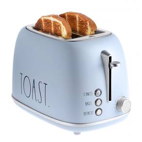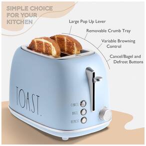 A Torradeira Rae Dunn Retrô Rounded Bread foi desenvolvida para uso doméstico no preparo de pães, bagels e waffles, combinando visual retrô com corpo em aço inoxidável na cor azul bebê. As inscrições na parte frontal seguem o estilo característico da marca e contribuem para a composição estética da cozinha, mantendo aparência discreta na bancada.