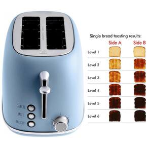 O aparelho conta com 2 fendas largas de aproximadamente 3,8 cm, adequadas para fatias mais espessas de pão, bagels e waffles. A potência de 825W em 110V oferece aquecimento adequado para uso diário. O seletor com 6 níveis de tostagem permite ajustar o grau de dourado, enquanto os botões dedicados para bagel, descongelar e cancelar permitem controlar o ciclo de tostagem de forma prática.