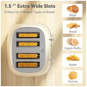 Torradeira retrô KitchMix para 4 fatias, com 6 níveis de tostagem, slots extra largos de 3,8cm, funções Bagel, Descongelar, Reaquecer e Cancelar, bandejas removíveis para migalhas e potência de 1650W.Permite ejeção manual