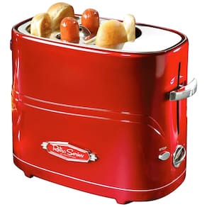 Torradeira retrô para até 2 cachorros quentes e pães simultaneamente, com timer ajustável e botão de parada. Inclui mini pinças e gaiolas para manuseio seguro.
