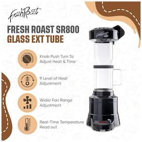 Tubo de extensão de vidro: um acessório que aumenta a capacidade do torrador para até 300 ml de grãos verdes. Ele também melhora a visibilidade e a uniformidade da torra. Ele é feito de vidro temperado resistente ao calor.