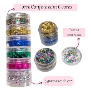Torre de Gliter Confete em Gel Maquiagem Artistica Festa Torre Glitter de Gel Confete Magia com 06 Cores de 5g cada, sendo: - 01 Dourado; - 01 Azul; - 01 Verde; - 01 Rosa; - 01 Prata; - 01 todas cores misturadas . Proporcionando uma variedade de opções para criar looks deslumbrantes. Tampa de Rosca: Prático e fácil de usar, com tampa de rosca para garantir a durabilidade do produto. Pigmentação Impecável e Duradoura: Aplique com confiança, sabendo que a pigmentação se destaca e permanece vívida ao longo do tempo. Ideal para o Carnaval e outras festividades, a Torre Glitter de Gel Confete Magia é a escolha perfeita para adicionar um toque mágico ao seu visual festivo As Cores Podem Variar de Acordo com As Configurações do Seu Monitor e Podem Sofrer Variação de Cor ou Padrão de Acordo com o Seu Lote. Imagem ilustrativa. Marca: Não Informado
