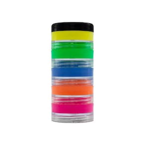 Torre de tinta néon - color make Kit glitter iridescente com 5 potes de 3g cada O kit glitter iridescente possui 5 cores diferentes e vibrantes que brilham na luz negra Ideal para dar aquele toque especial nas suas maquiagens. Especificações Torre com 5 potes de 3g cada na cores: amarelo, azul claro, laranja, pink e verde limão. Ean: 7898595468519