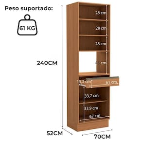 Peso Suportado: 20kg prateleira do forno/microondas, 7kg por prateleira e 6kg por gaveta.