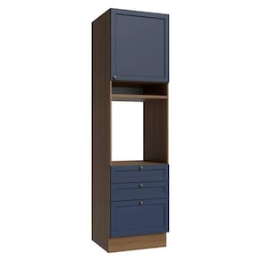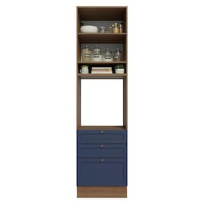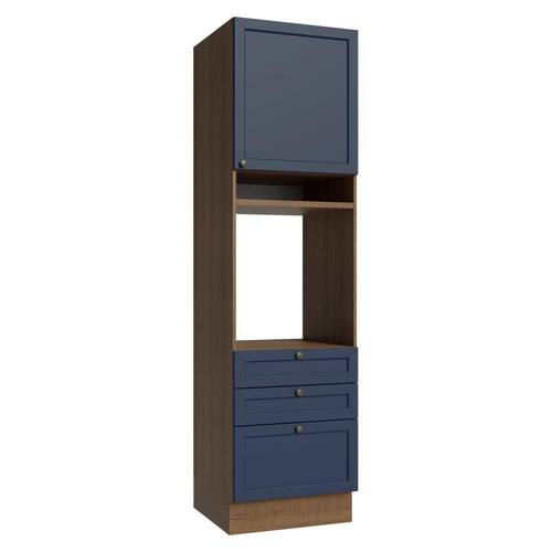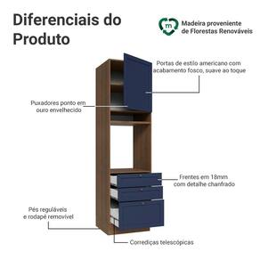 O acabamento de alta resistência da estrutura é em tom amadeirado Rustic e das frentes em Azul, refletindo o estilo americano com um toque moderno. Possui uma textura suave ao toque, trazendo leveza e sofisticação ao ambiente. O destaque vai para os puxadores ponto em ouro envelhecido, feitos com metal resistente, que adicionam personalidade e um charme único.