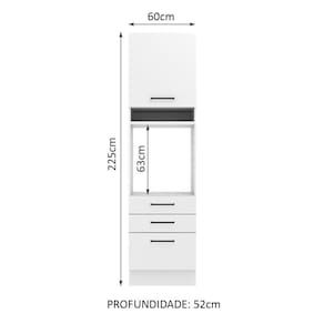O espaço para forno é de 63 cm x 57 cm com abertura para saída do calor. Permite também a instalação de forno embutido. Além disso possui um nicho decorativo para deixar itens do dia a dia mais a mão. Os pés são em PVC com regulagem de altura e rodapé removível de madeira de fácil encaixe.