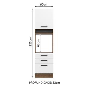 O espaço para forno é de 63 cm x 57 cm com abertura para saída do calor. Permite também a instalação de forno embutido. Além disso possui um nicho decorativo para deixar itens do dia a dia mais a mão. Os pés são em PVC com regulagem de altura e rodapé removível de madeira de fácil encaixe.