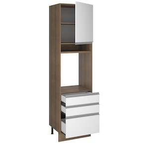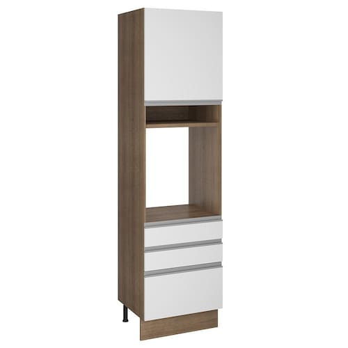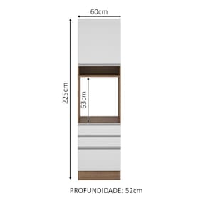 Sua altura é de armário planejado com 225 cm de altura e espaço para forno de 63 cm x 57 cm com abertura para saída do calor. Além disso possui um nicho decorativo para deixar itens do dia a dia mais a mão. Os pés são em PVC com regulagem de altura e rodapé removível de madeira de fácil encaixe. Este módulo precisa ser fixado na parede.